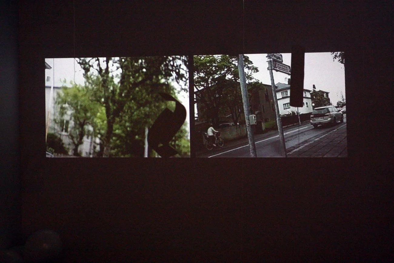 Einnig eru á sýningunni málverk af gönguleiðinni sem birtist í myndbandinu og í rýminu svífa pappírsskúlptúrar.