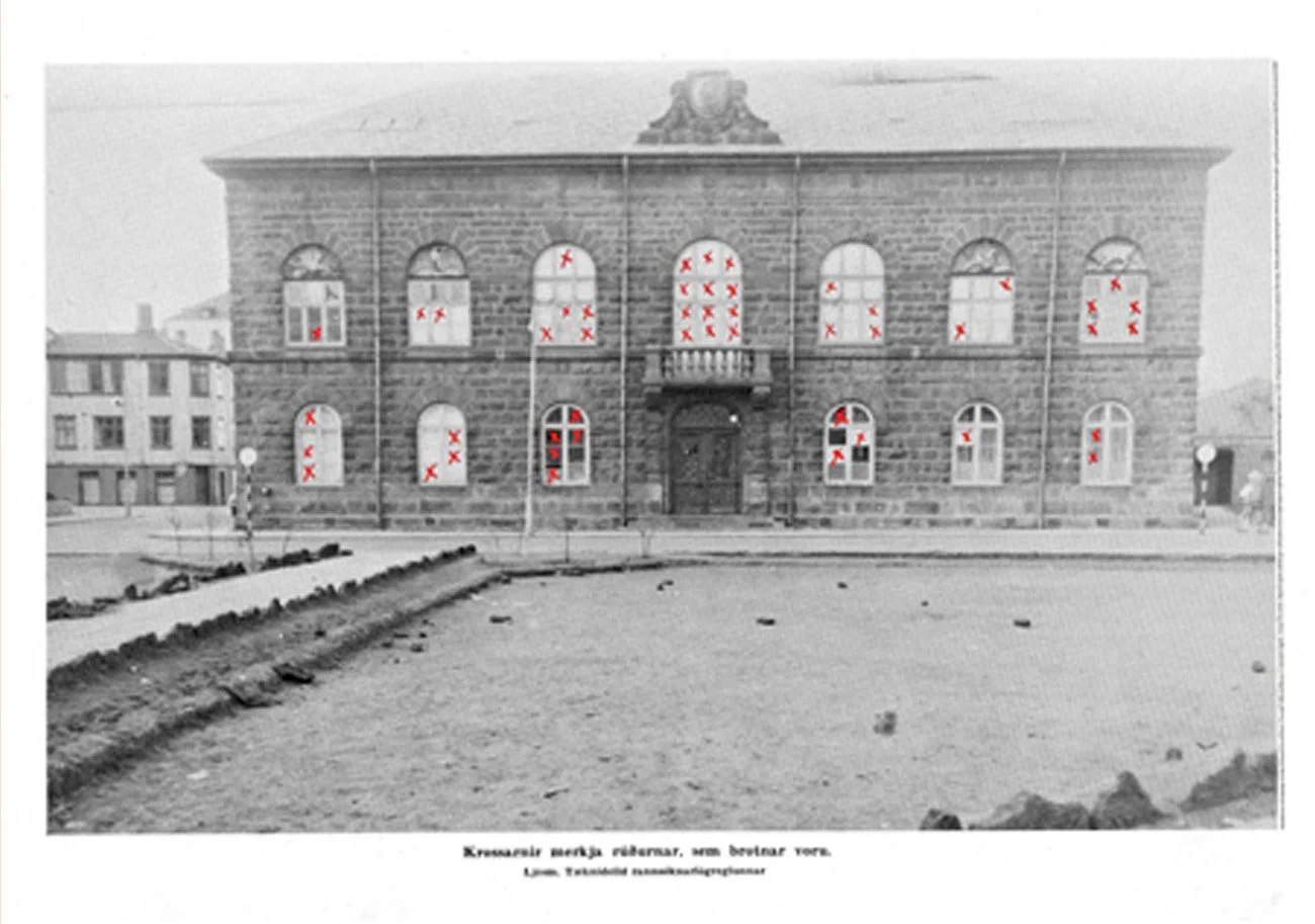 Ein ljósmynd sýningarinnar er sönnunargagn safnað af Tæknideild Rannsóknarlögreglunnar og sýnir afleiðingar óeirðar almennra borgara í tengslum við inngöngu Íslands í Atlantshafsbandalagið 30. mars 1949.